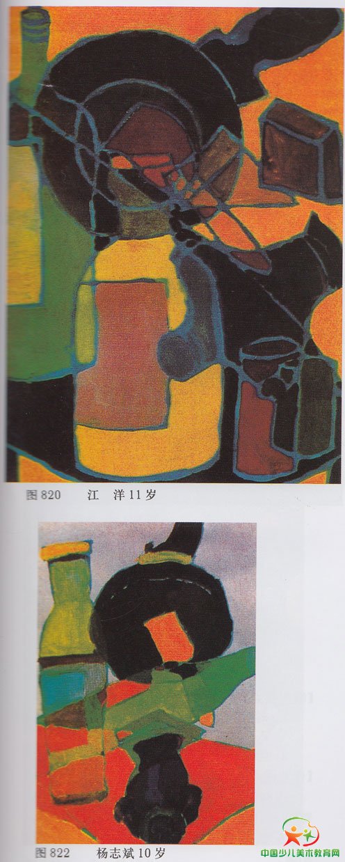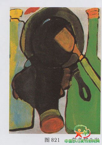 图820这幅作业在形与色的构成方面都较好,具有一定的形式美感。图82l、图822在色彩配置上比较明朗。在构图方面:前一幅有些满,而且有些呆板;后一幅有些空,主体与边框关系处理得不好。