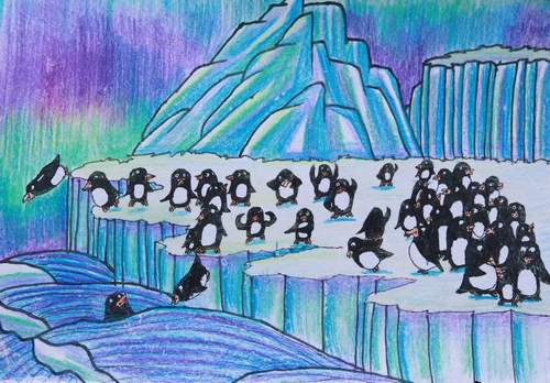 作品名称:《极光下的企鹅家族》