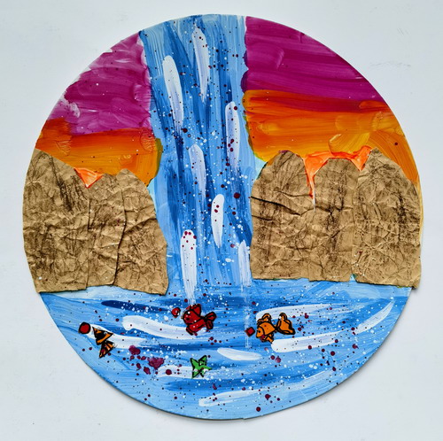 彩瀑游鱼图