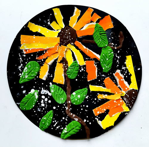 彩片黏土花.黑盘上的童趣花园