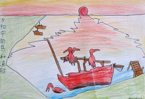 夕阳中的鸟和渔船